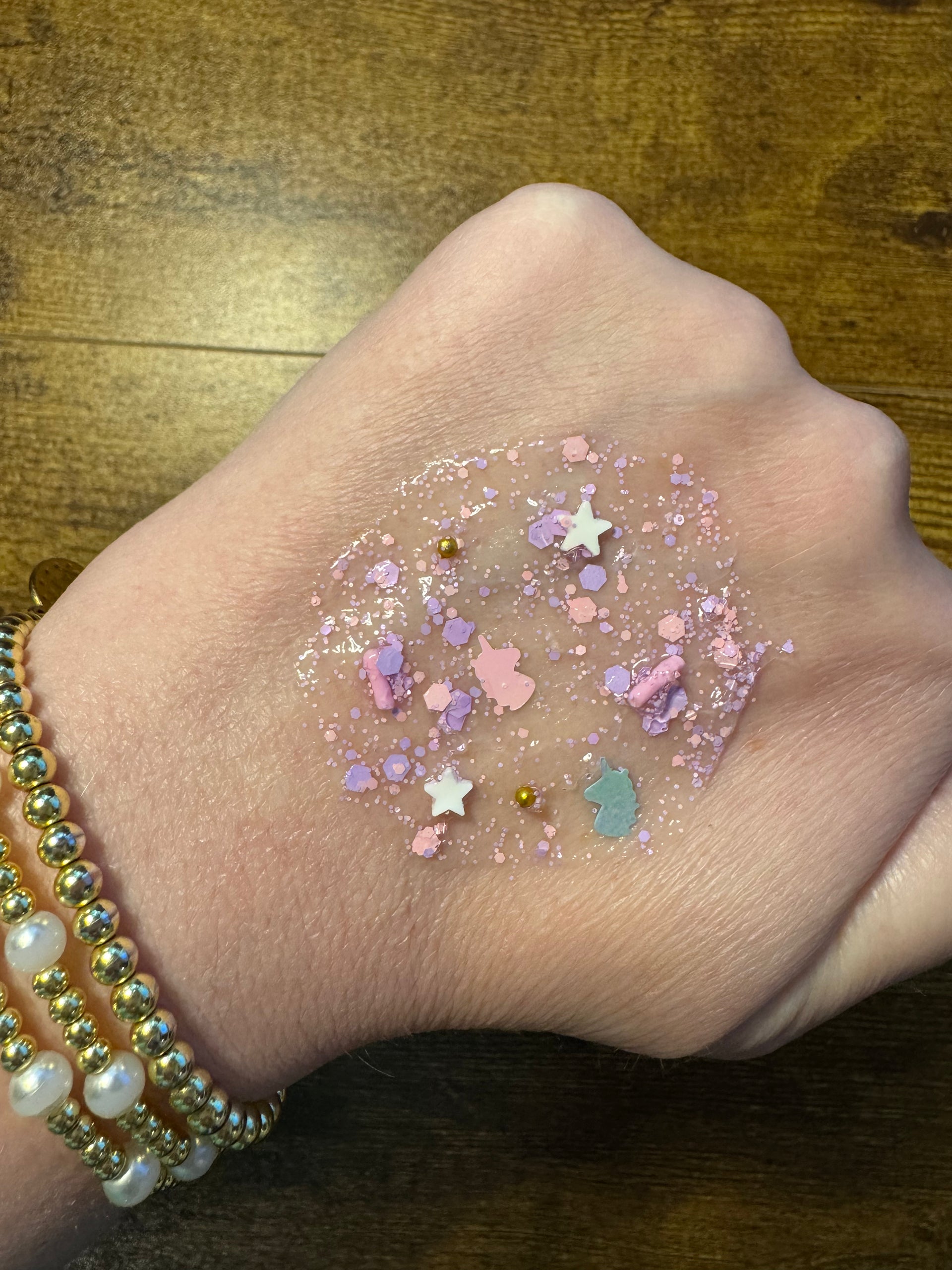 Unleash your inner magic with Sparkle Like A Unicorn Hair Glitter! This unicorn themed hair glitter features a dreamy pastel base of pink and purple, adorned with iridescent unicorns and delicate pink and gold sparkles. Let your hair shine and shimmer like a unicorn's mane.