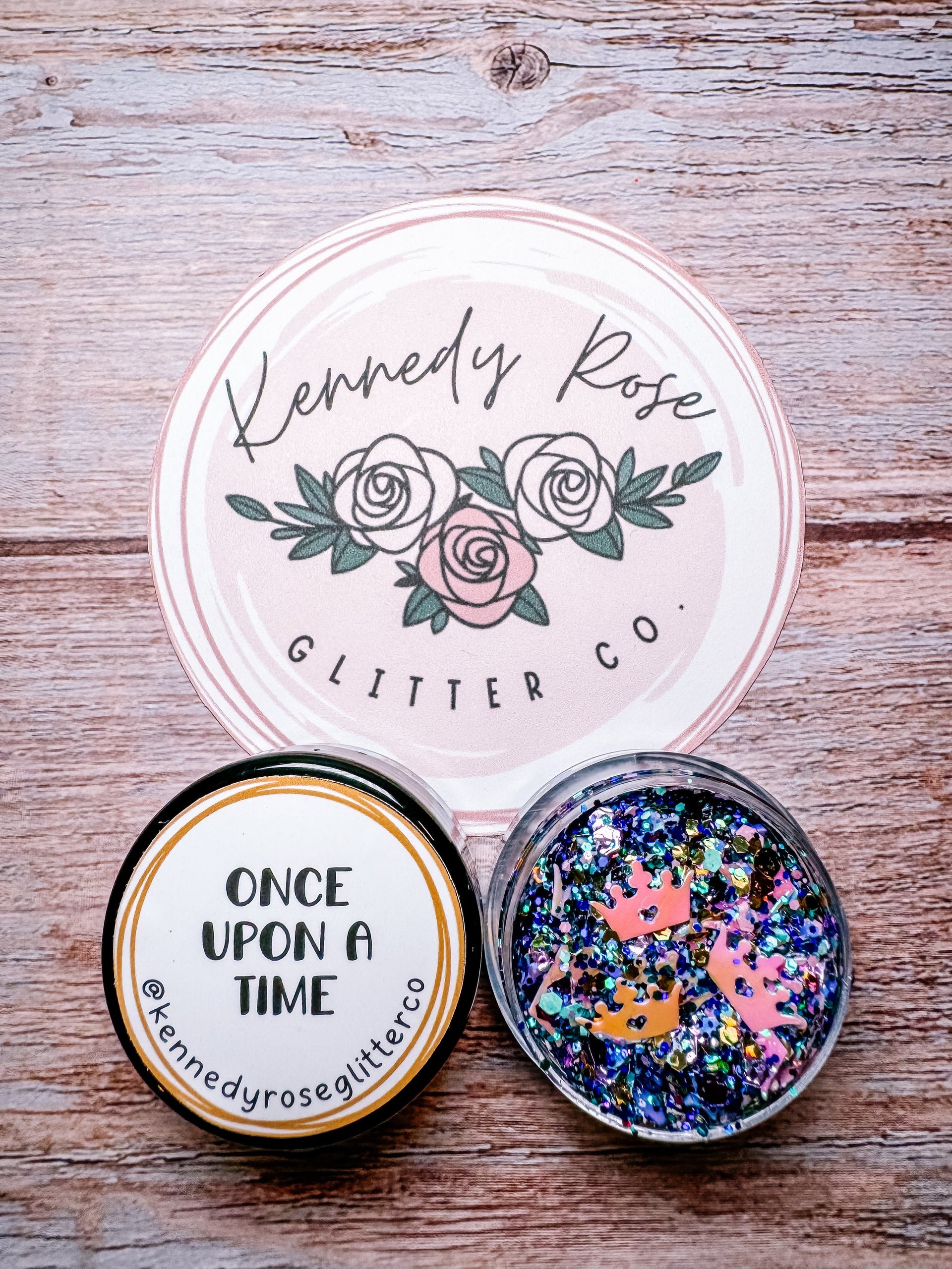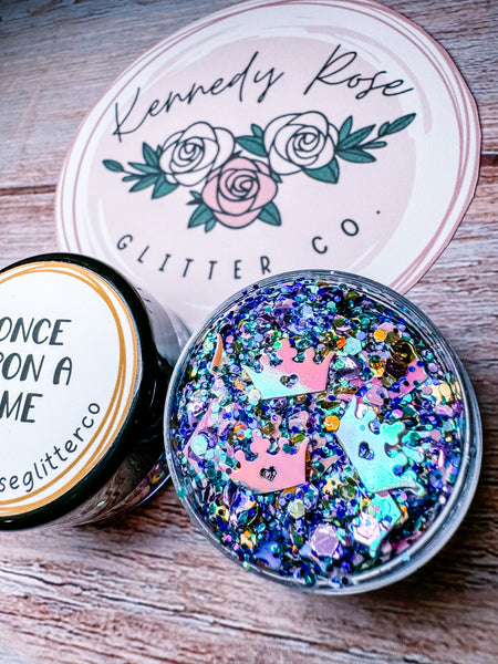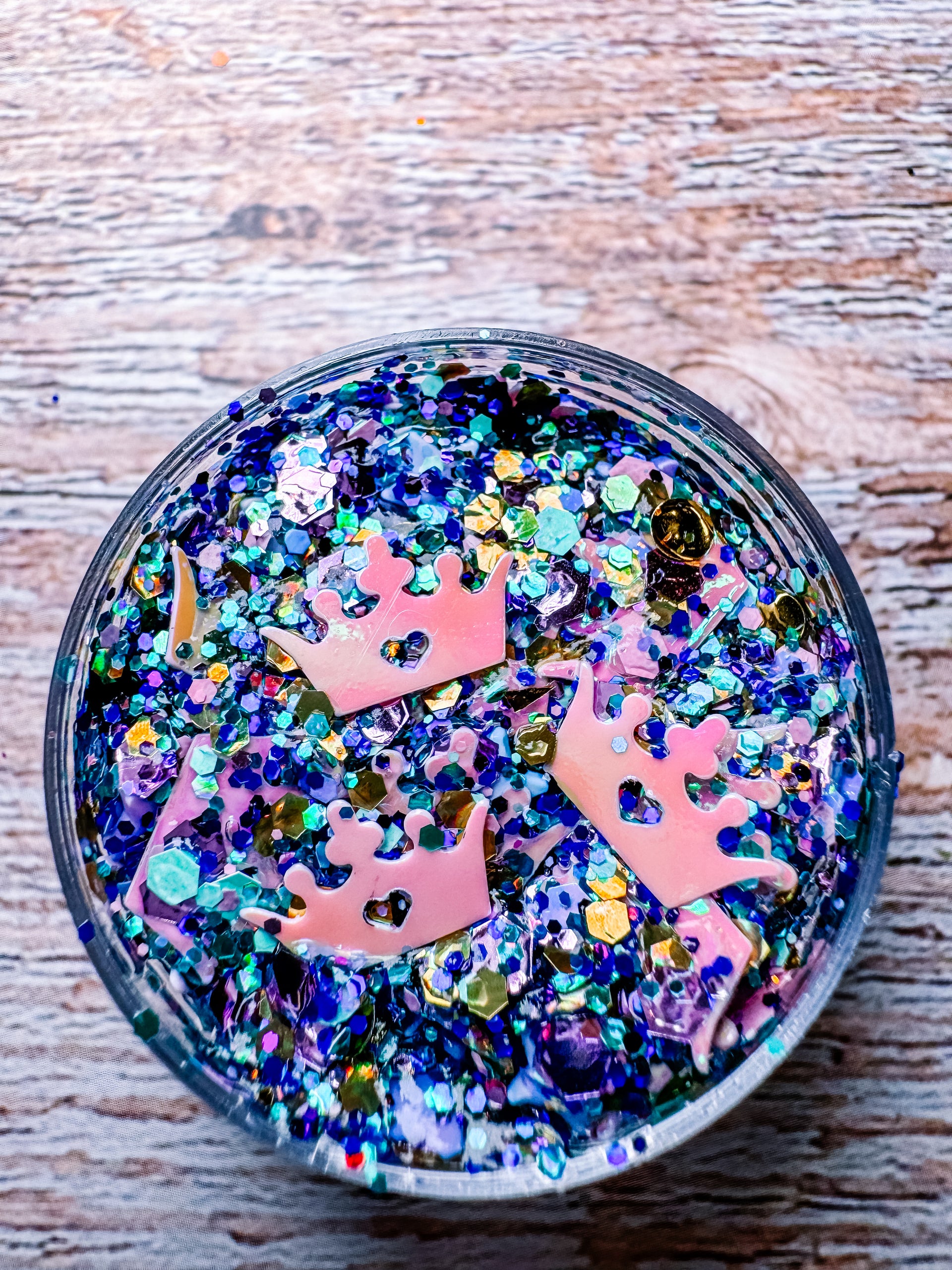 Get ready to sparkle like a true princess with Once Upon A Time! This magical hair glitter features a whimsical mix of purple, gold, and teal, adorned with pretty pink crowns fit for royalty. Elevate your hair game and add a touch of enchantment to any look.