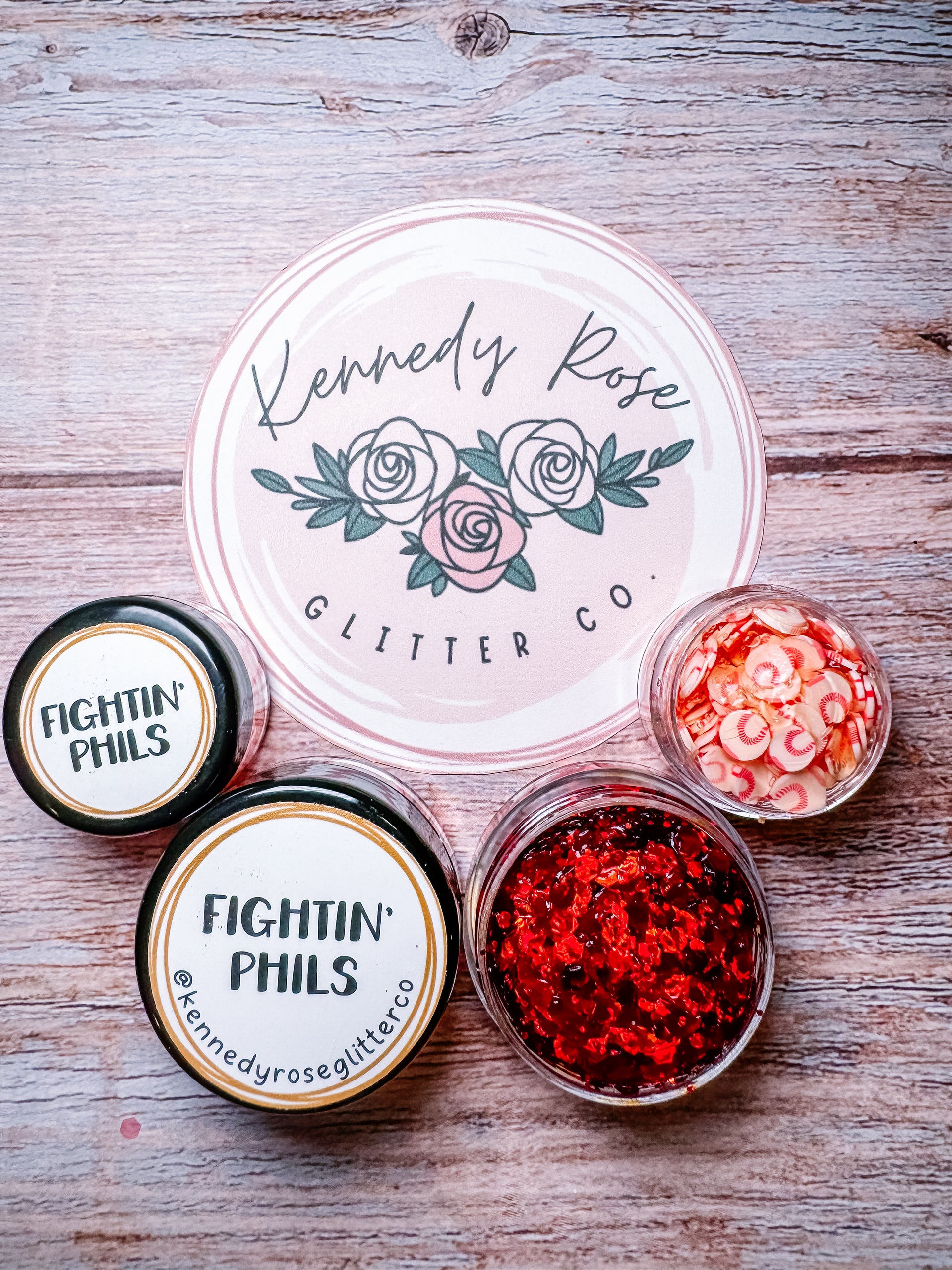 Fightin' Phils will ship in two separate containers (as pictured) to prevent any staining on the white baseballs from the red glitter. We recommend applying the red glitter base first, and then layering the baseballs on top.