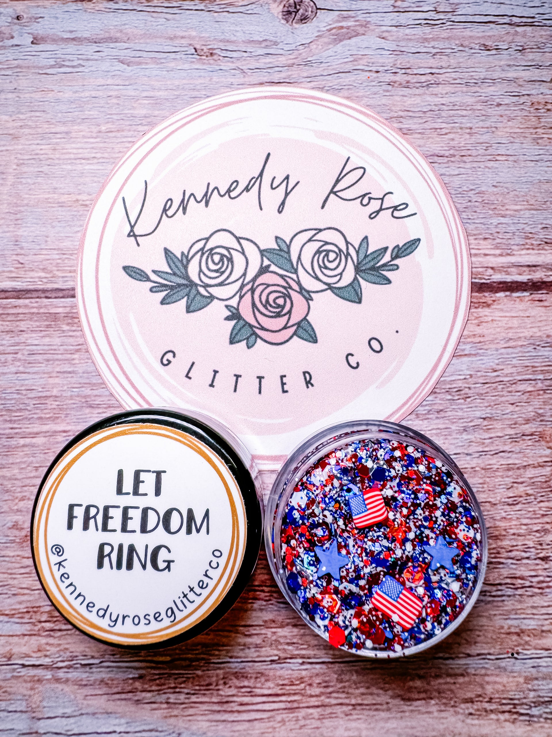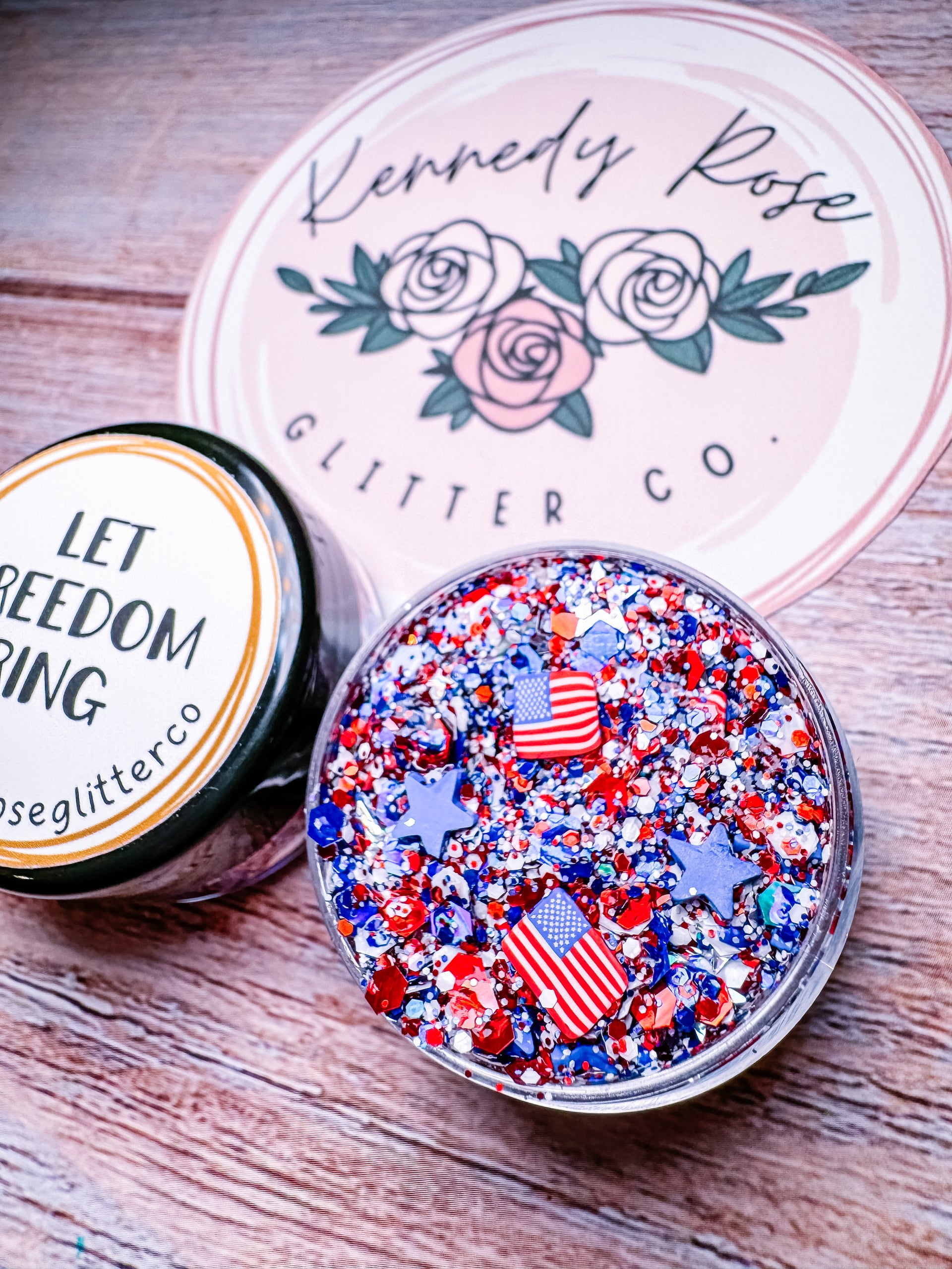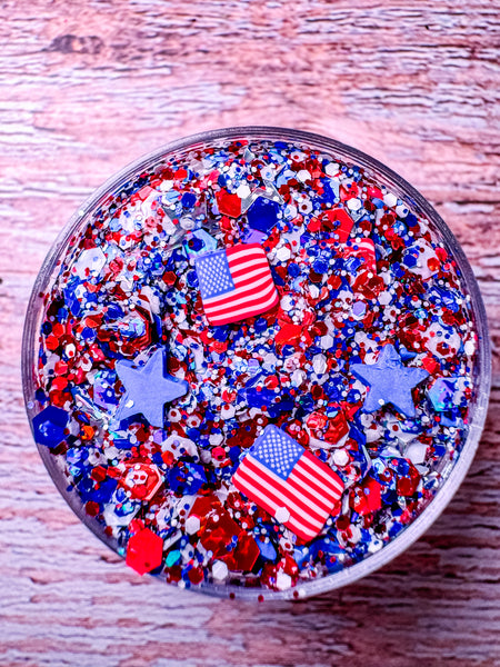It’s a party in the USA! Get ready to show off your patriotic spirit with Let Freedom Ring. This unique hair glitter features red, white and blue shimmer, topped off with American flag and star embellishments. Perfect for any occasion where you want to stand out and embrace your love for our country. Wear it and let the compliments ring in! (See what we did there?)